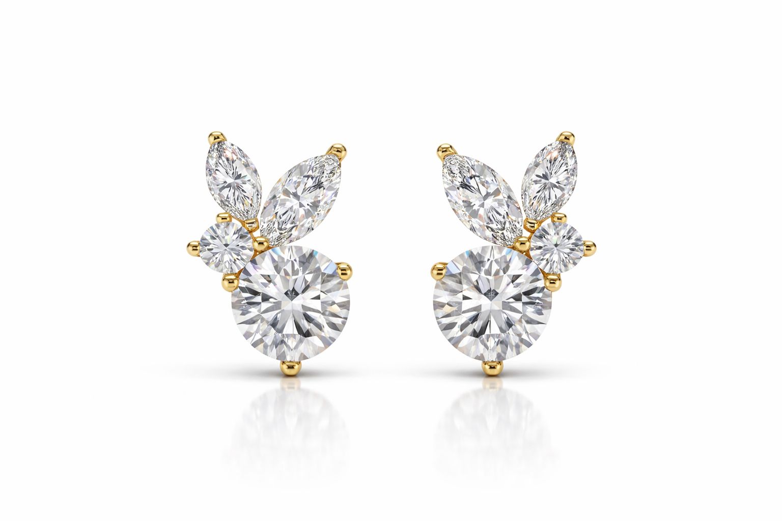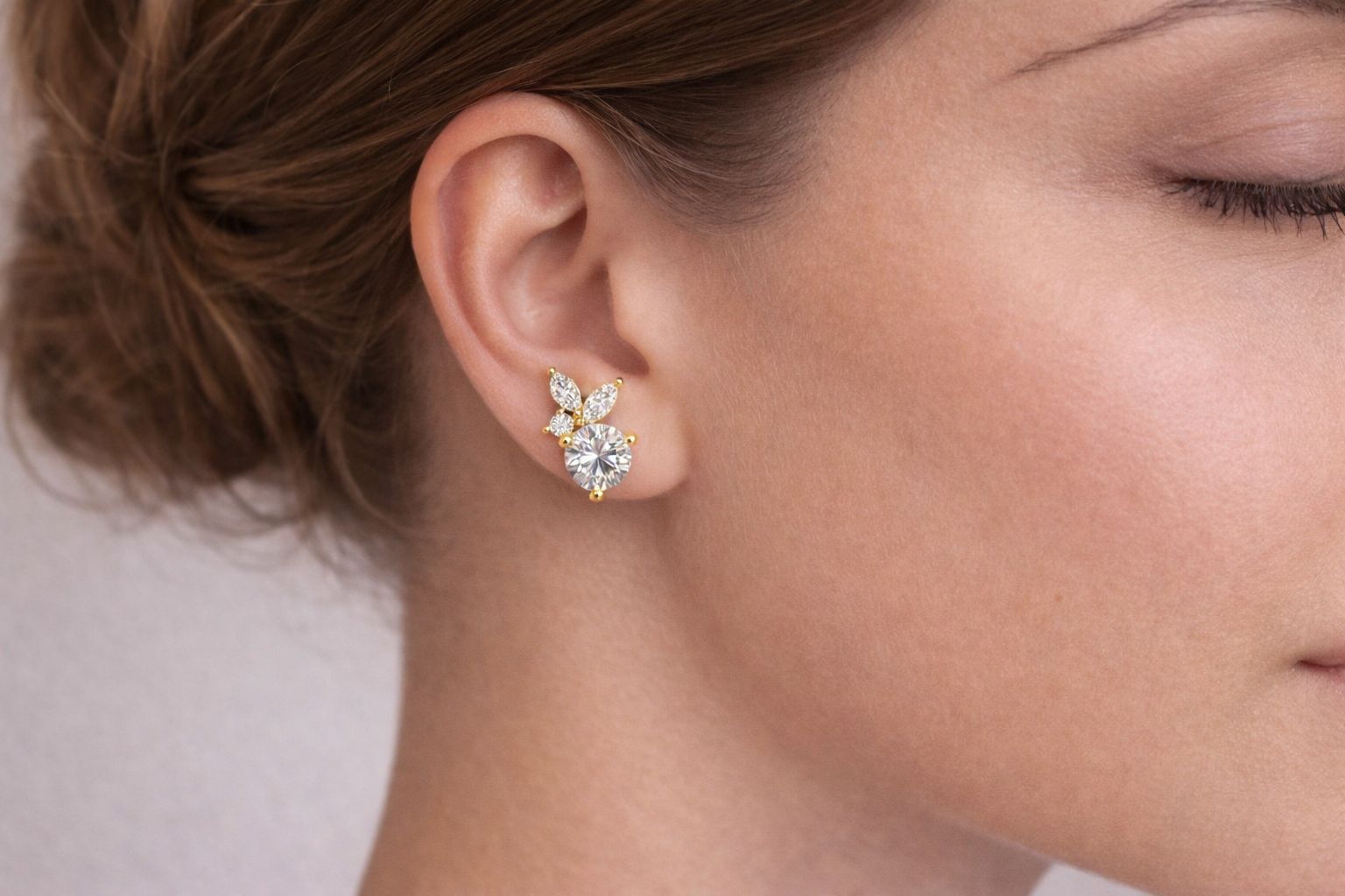 These elegant floral cluster diamond studs feature a brilliant round center diamond accented with marquise and round stones, creating a graceful leaf-inspired silhouette. Crafted in 14KT hallmarked yellow gold, the design offers the look of a larger statement piece while remaining lightweight and comfortable for everyday wear.
